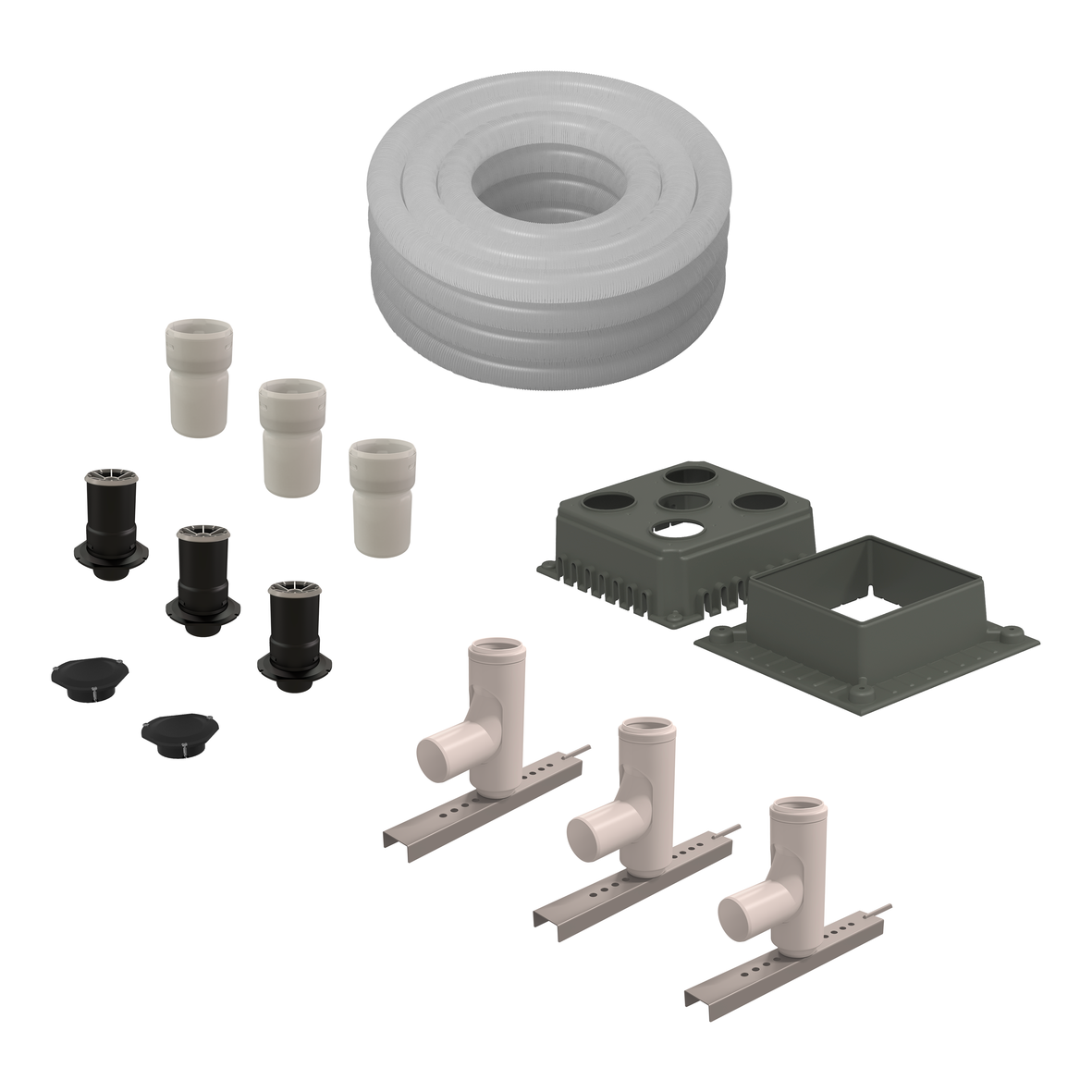 De toevoer van verbrandingslucht wordt gedeeld en vindt plaats via de ringvormige ruimte tussen de bestaande schoorsteen en de flexibele voeringen. De set bevat flexibele kanalen, bochten met schoorsteensteun, flexibele-naar-rigide verbindingsstukken en een gecombineerde aansluiting, wat zorgt voor een compacte, efficiënte en betrouwbare renovatieoplossing.