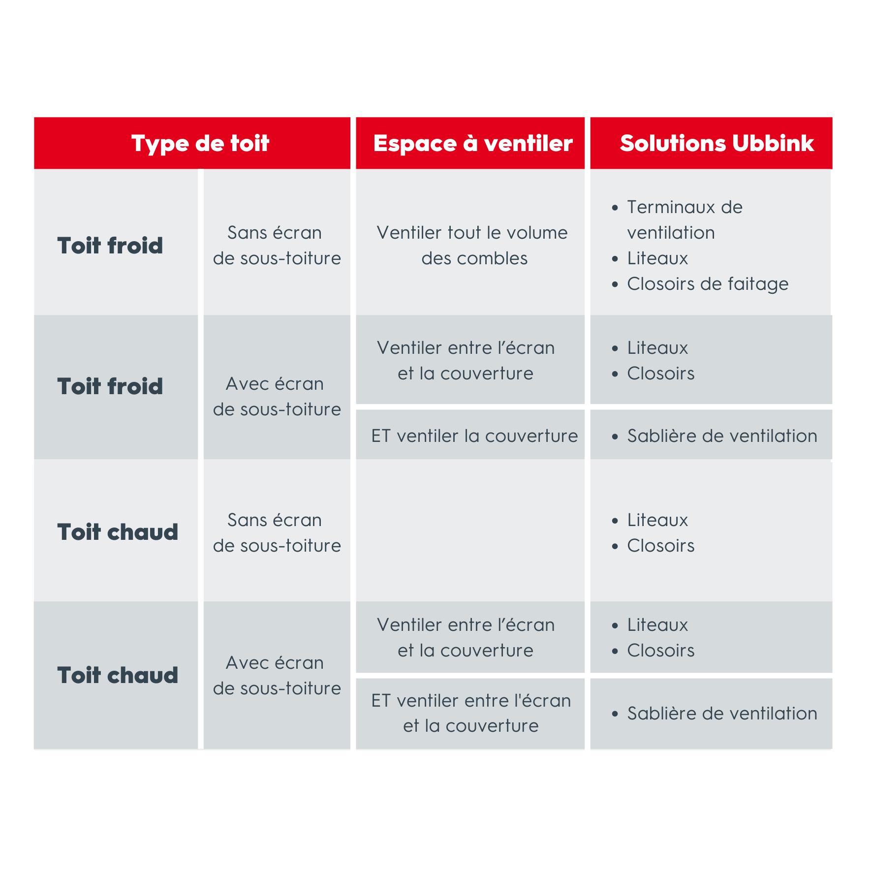 On distingue deux types de toitures, pour chacune d'entre elles, qu'un écran de sous-toiture soit en place ou non, diverses solutions existent :