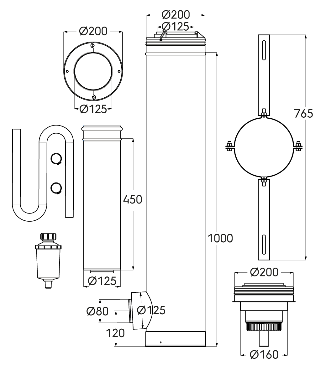 Kit départ suspension pour système Rolux 3CEp Condensation Concentrique en 125/200 comprenant tous les éléments pour équiper un étage avec une chaudière.
