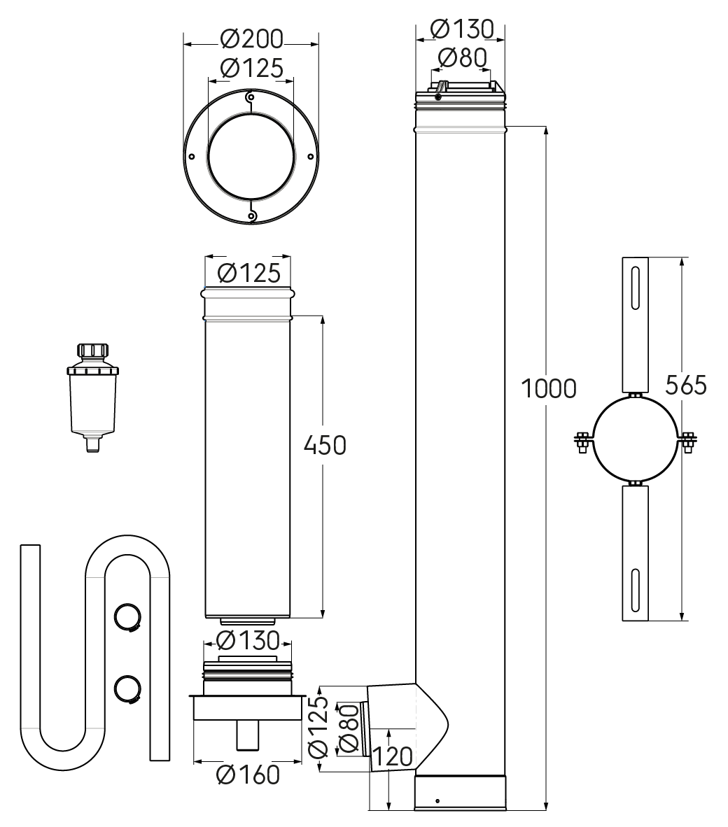 Kit départ suspension pour système Rolux 3CEp Condensation Concentrique en 80/130 comprenant tous les éléments pour équiper un étage avec une chaudière.