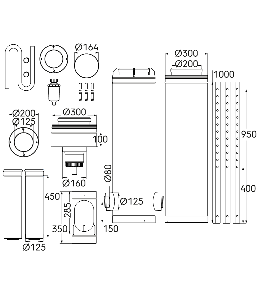 Kit départ support trépied pour système Rolux 3CEp Condensation Concentrique en 200/300 comprenant tous les éléments pour équiper un étage avec 2 chaudières à 180°.