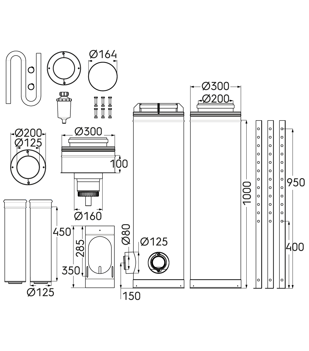 Kit départ support trépied pour système Rolux 3CEp Condensation Concentrique en 200/300 comprenant tous les éléments pour équiper un étage avec 2 chaudières à 90°.