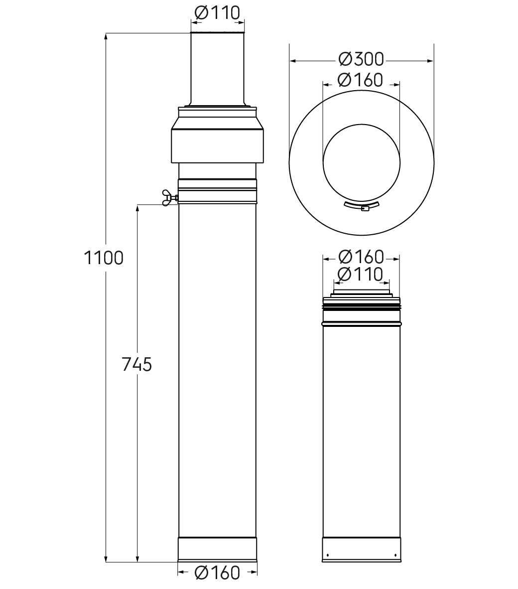 Kit toiture pour colonne 3CEp diamètre 110/160 comprenant tous les éléments pour se raccorder au terminal couleur inox avec entraxe entre dernier piquage à solin de 2000.