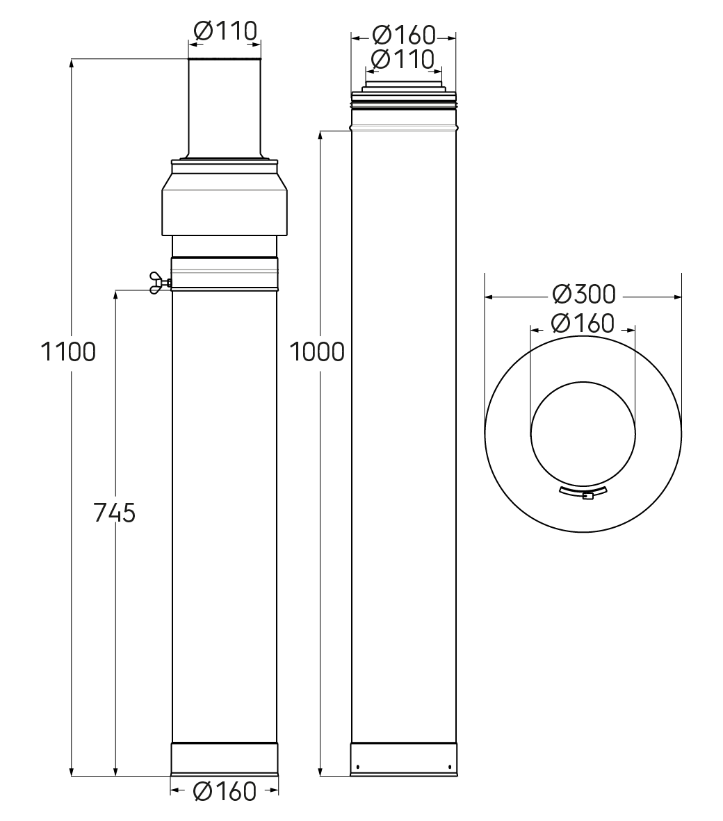 Kit toiture pour colonne 3CEp diamètre 110/160 comprenant tous les éléments pour se raccorder au terminal couleur inox avec entraxe entre dernier piquage à solin de 2500.