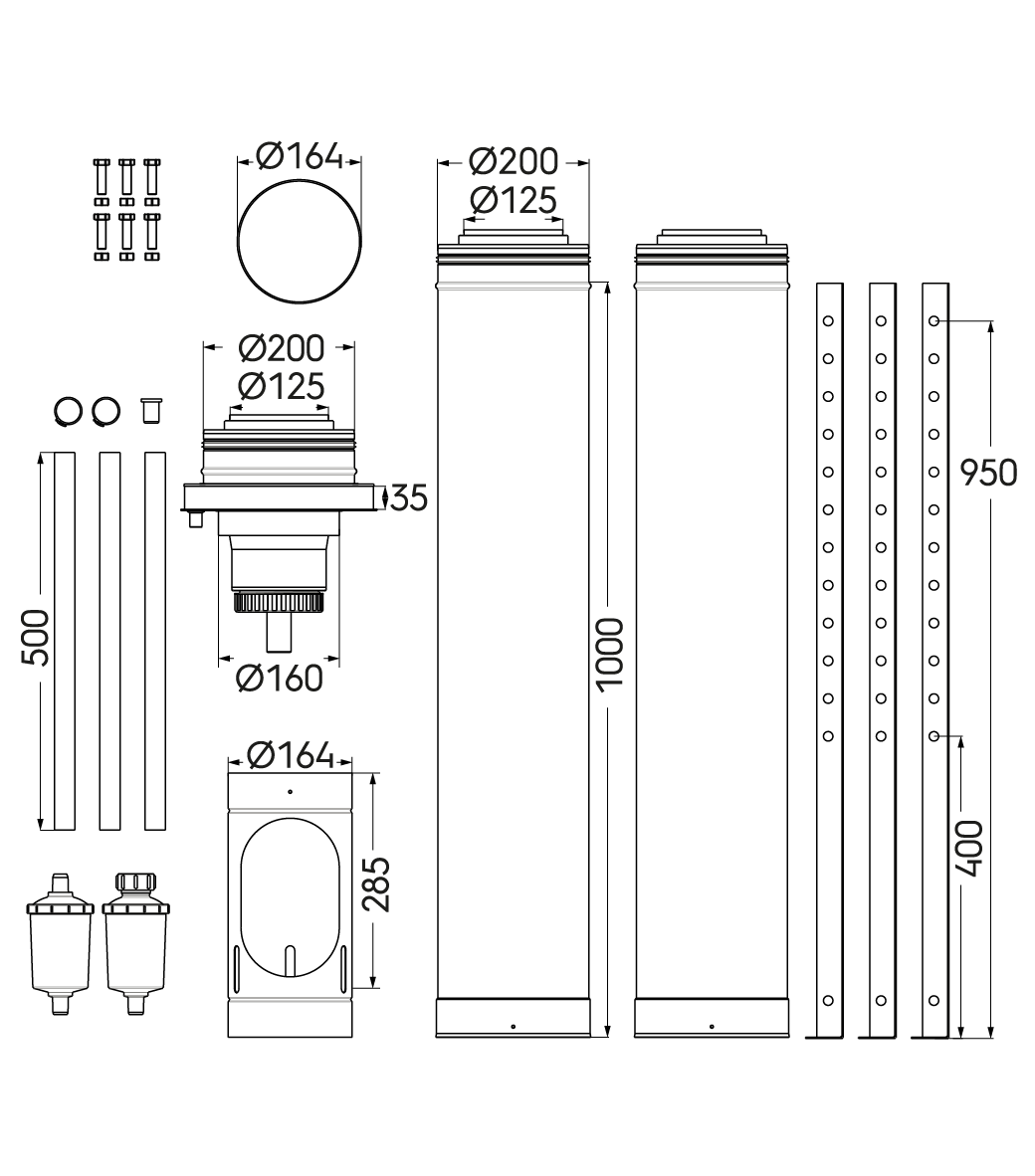 Kit départ support trépied pour système 3CET concentrique en 125/200 comprenant tous les éléments pour équiper un étage sans chauffe-eau.