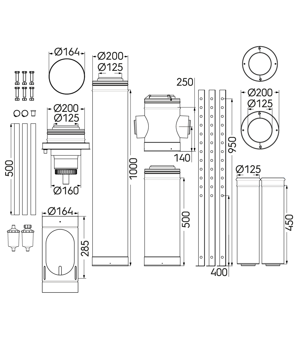 Kit départ support trépied pour système 3CET concentrique en 125/200 comprenant tous les éléments pour équiper un étage avec deux chauffe-eaux thermodynamiques à 180°.