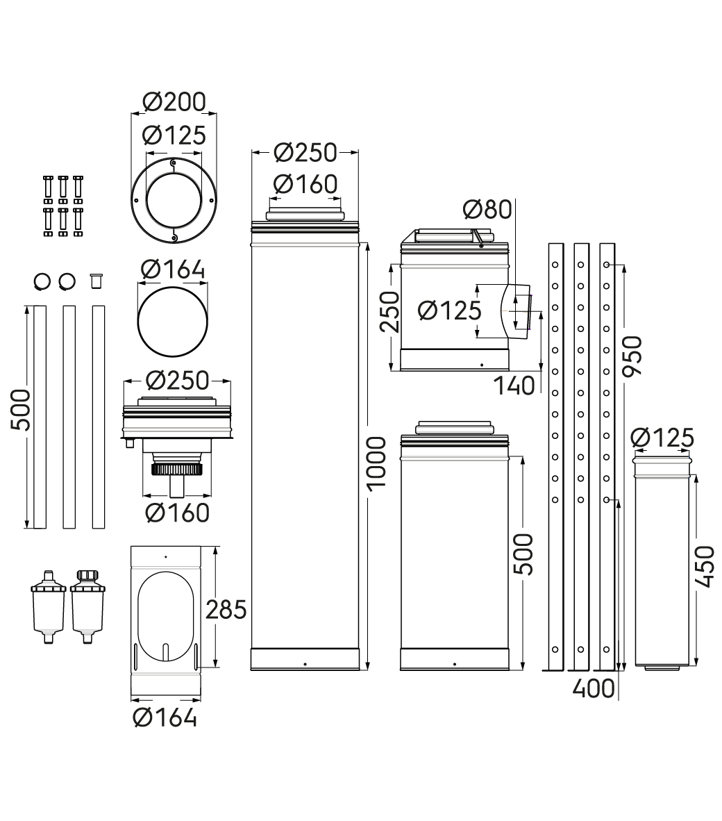 Kit départ support trépied pour système 3CET concentrique en 160/250 comprenant tous les éléments pour équiper un étage avec un chauffe-eau.