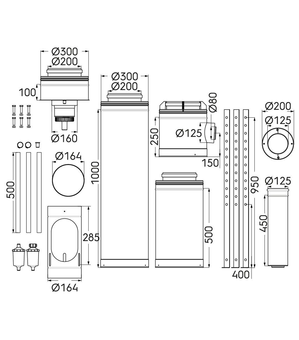 Kit départ support trépied pour système 3CET concentrique en 200/300 comprenant tous les éléments pour équiper un étage avec un chauffe-eau.