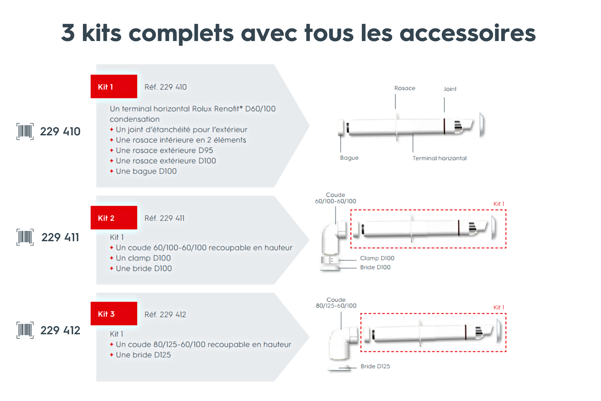 Le Rolux Condensation RENOFIT est destiné au remplacement d'anciennes chaudières murales de type C1 installées avec un terminal horizontal 60/100. Ce terminal horizontal de rénovation permet d'installer un nouvel appareil à condensation en réutilisant en partie le conduit existant de l’ancienne chaudière. Le coude et le terminal recoupables permettent un ajustement optimal avec l'ancienne installation.