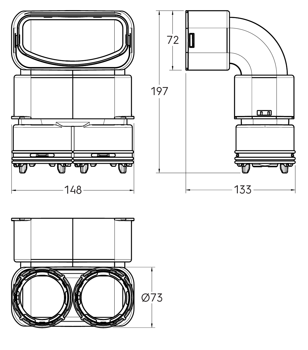 The 2x AE23C - AE55SC Vertical Bend Adaptor Kit seamlessly connects two AE23C ducts with an AE55SC duct making it possible to create a vertical 90° bend in your system, ensuring a quick, secure and tool-free installation. Includes two AE23C Click-Seal Rings and one AE55SC Seal Ring.