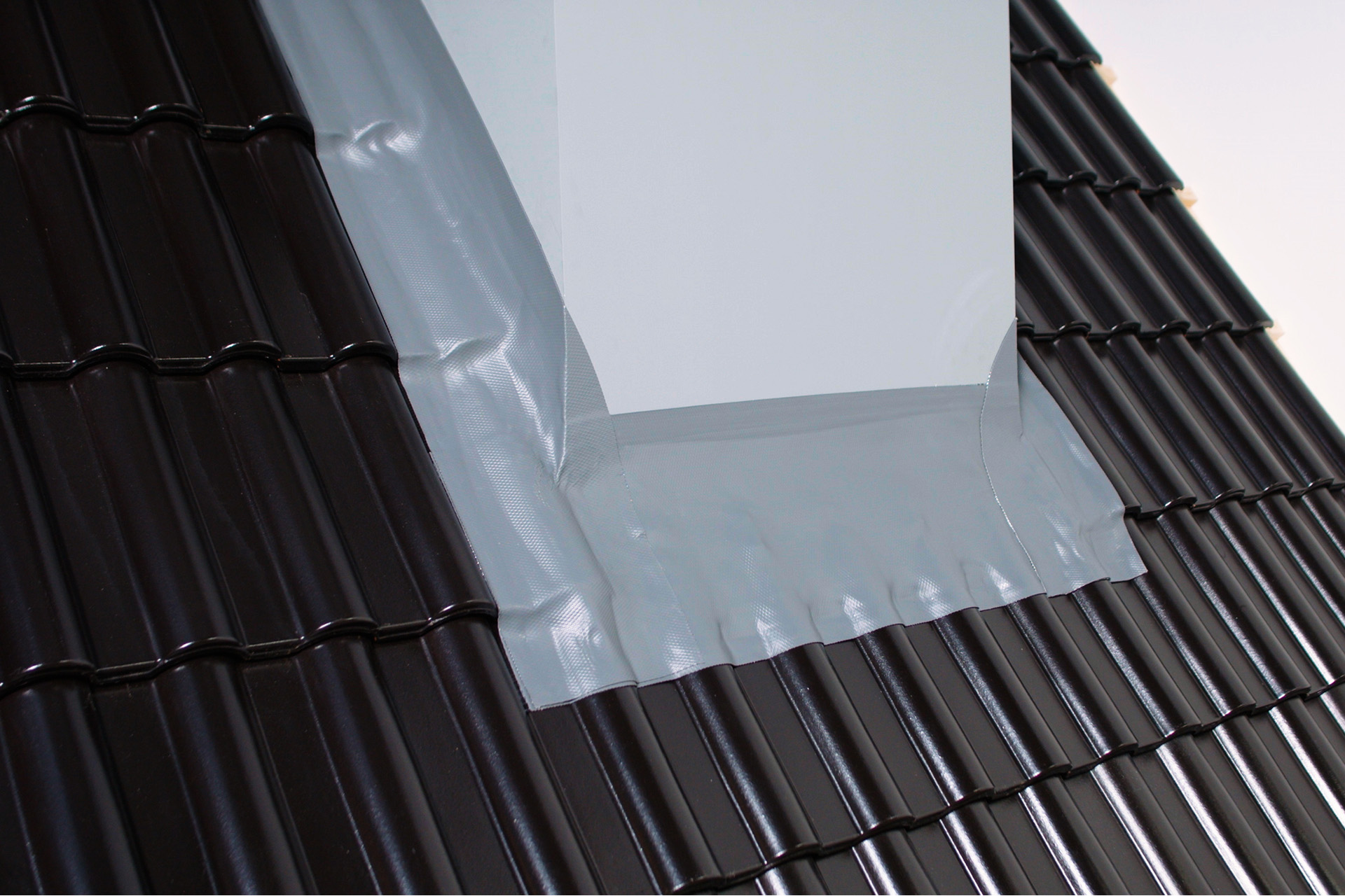 Daarna wordt de onderste plakstrip verwijderd, breng je Ubiflex Finio aan en rol je met de Finio roller de waterdichte afsluiting tegen de dakpannen. Zonder dat je verder nog iets hoeft te doen, hechten de butylstroken en zelfklevende achterzijde zich meteen aan de ondergrond. Overlappen de Finio-delen elkaar op de hoek of rond een detail... door de vulkanisatie die optreedt in het materiaal is zelfs hier de dakaansluiting volledig waterdicht.