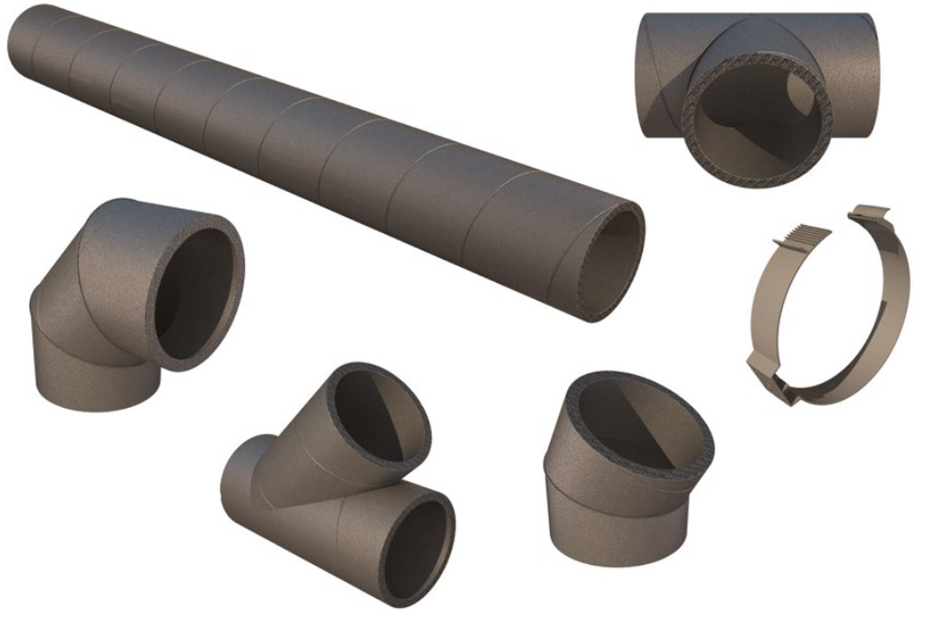 - Geïsoleerde kanalen in de maten 125, 150, 160, 180 en 200 mm