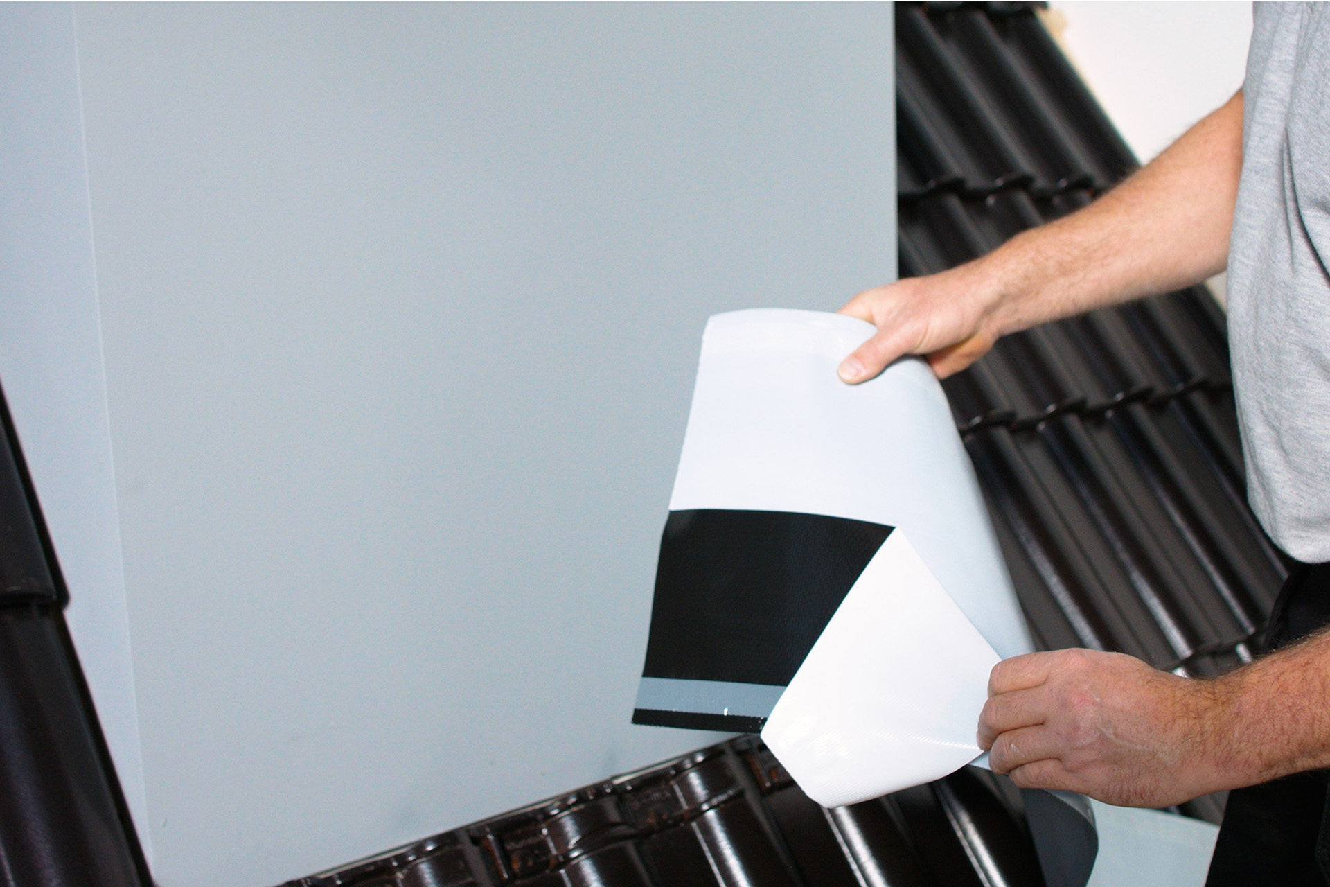 Ubiflex Finio loodvervanger is zelfklevend en verwerk je voor een groot deel met de hand. Daardoor bespaar je veel tijd en kun je tot drie keer sneller op het dak werken. Na het op maat maken en verwijderen van de plakstroken modelleer je de loodvervanger met de hand in de gewenste vorm en druk je het materiaal tegen het oppervlak. Aankloppen is niet nodig; narollen met de Ubiflex roller volstaat. Het dak is direct waterdicht door de butylstroken aan de boven- en onderkant én de zelfklevende achterzijde.