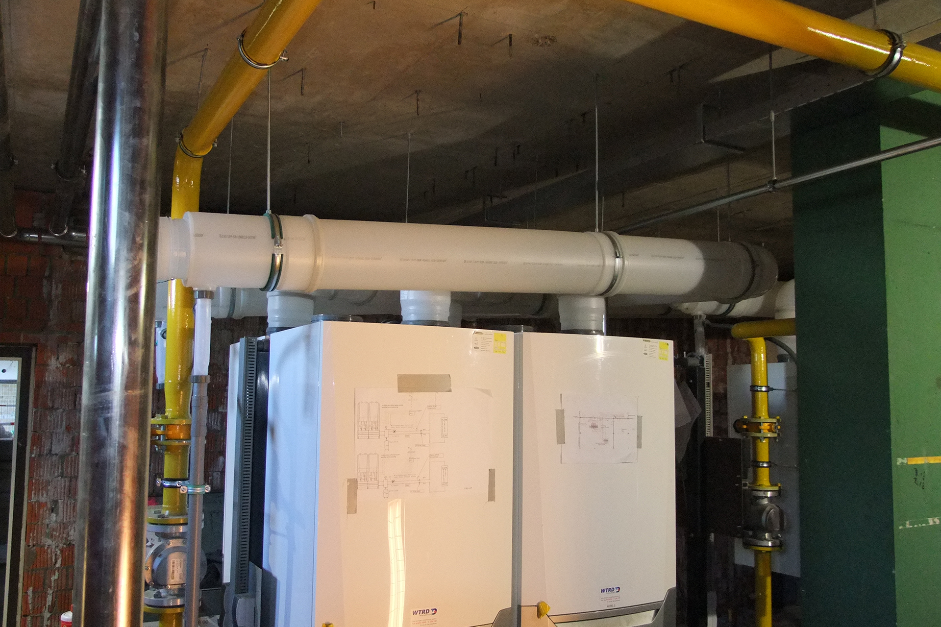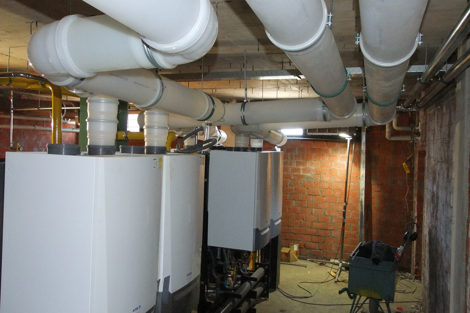 “De bestaande rookgasafvoer van de cv-ketels was van staal en had een te grote diameter”, gaat Sjaak van de Witte verder. “We hebben Ubbink gevraagd mee te denken over een alternatief.” Oorspronkelijk was het idee om in de stookruimte op de begane grond een dubbele opstelling te realiseren: 1x2 en 1x4 cv-ketels van Remeha. Volgens Bert Lodewijckx, rayonmanager installatie bij Ubbink, zou dat niet lukken: “De opstelling van vier ketels zou dan een rookgasafvoer met een diameter van 280 mm