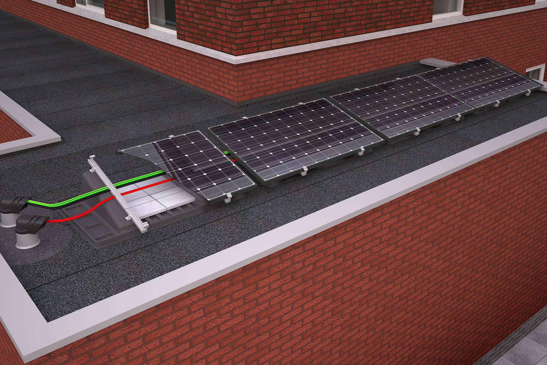 Na het verwijderen van de dakpannen, breng je de Solar Onderlaag van HDPE-kunststof vanaf de rol aan op de panlatten. De Solar Onderlaag garandeert de waterdichtheid van het dak. De onderlaag is eenvoudig op maat te maken en aan te brengen. Door de vormvrijheid is de onderlaag geschikt voor zowel landscape als portrait gelegde zonnepanelen. Op de onderlaag worden vervolgens de Solar Bevestigingsankers bevestigd. Deze dragen de Solar Montagerails voor de PV-panelen.